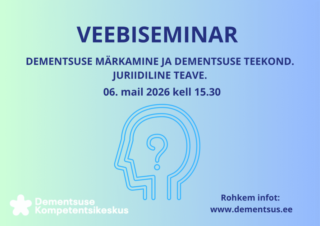 6. mail kell 15.30 toimub veebiseminar „Dementsuse märkamine ja dementsuse teekond. Juriidiline teave“