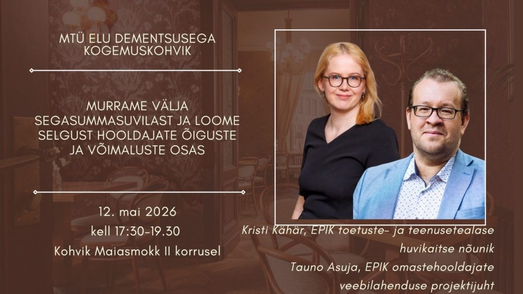 MTÜ Elu Dementsusega poolt korraldatud kogemuskohvikus keskendutakse lähedase hooldamisega seotud küsimustele, mis tekitavad sageli segadust ja ebakindlust. Eesti Puuetega Inimeste Koja omastehooldajate veebilahenduse projektijuht Tauno Asuja ja toetuste- ning teenusetealase huvikaitse nõunik Kristi Kähär räägivad teemadest, milleni hooldaja ise alati ei pruugi jõuda, kuid mis võivad igapäevaelus olla väga olulised.